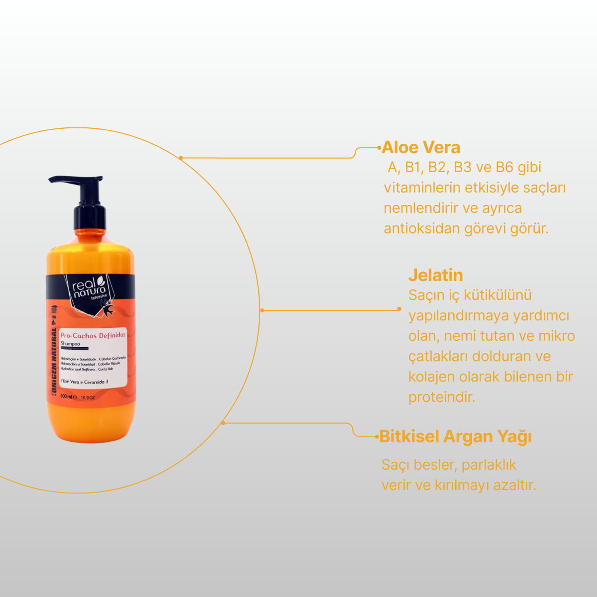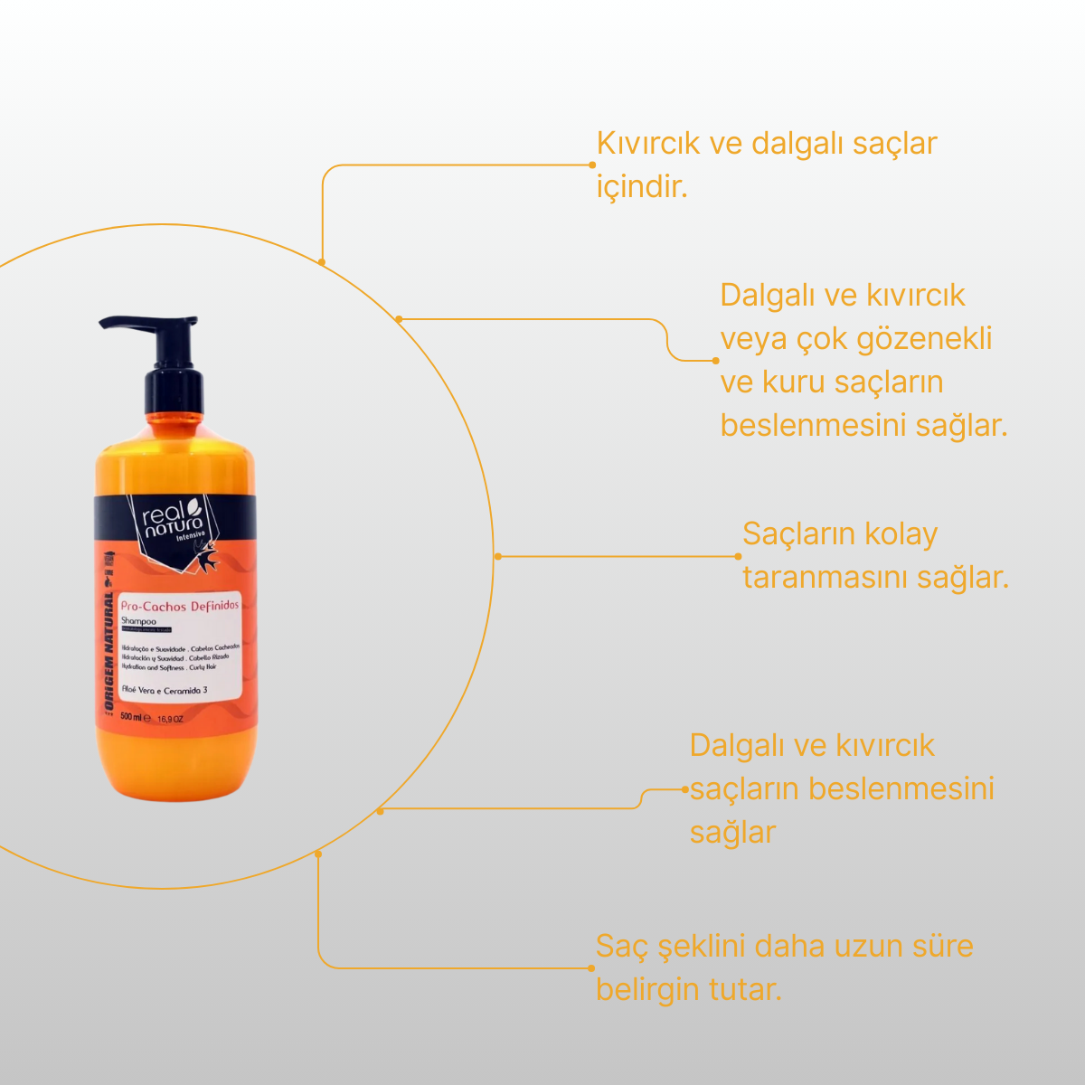 REAL NATURA PRO-CACHOS DEFINIDOS şampuan, dalgalı ve kıvırcık veya çok gözenekli ve kuru saçların beslenmesine, nemlenmesine ve kolay açılmasına yardımcı olan, buklelerin düzgün şekillerinin uzun süre tutulmasını sağlayan bir şampuanfır.